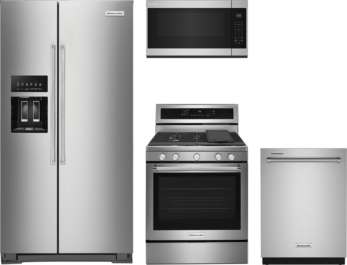 KitchenAid® 4 Piece Stainless Steel Kitchen Package with a side-by-side refrigerator, free standing gas range, over the range microwave and built in dishwasher.Read More