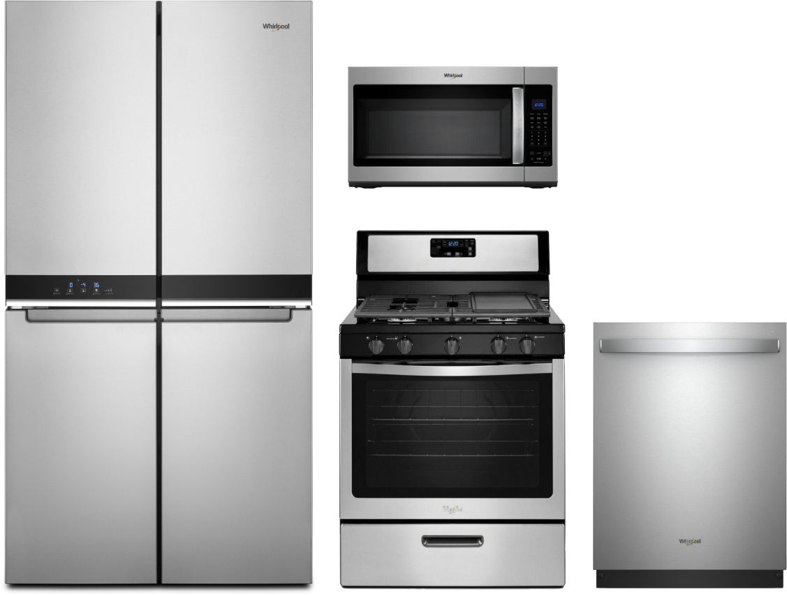 Whirlpool® 4 Piece Kitchen Package-Stainless Steel with a French Door Refrigerator, freestanding gas range, built in dishwasher and over the range microwaveRead More